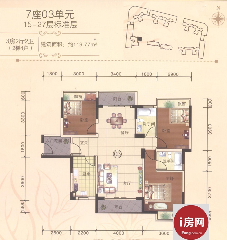 华福·城南1号7座03单位户型图3室2厅2卫1厨 119.77㎡